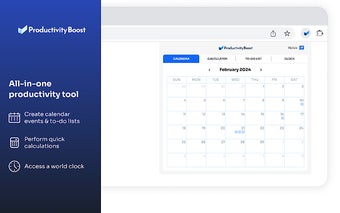 生产力提升是一个免费的Chrome扩展,旨在通过直接从工具栏提供快速访问各种生产力工具来简化您的工作流程。用户可以轻松管理他们的时间,具有日历功能用于安排日常和每月事件,简单的计算器用于快速算术,以及可自定义的待办事项列表用于任务管理。此外,该扩展还包括一个笔记功能,用于记录重要信息和一个世界时钟,用于查看国际时区。